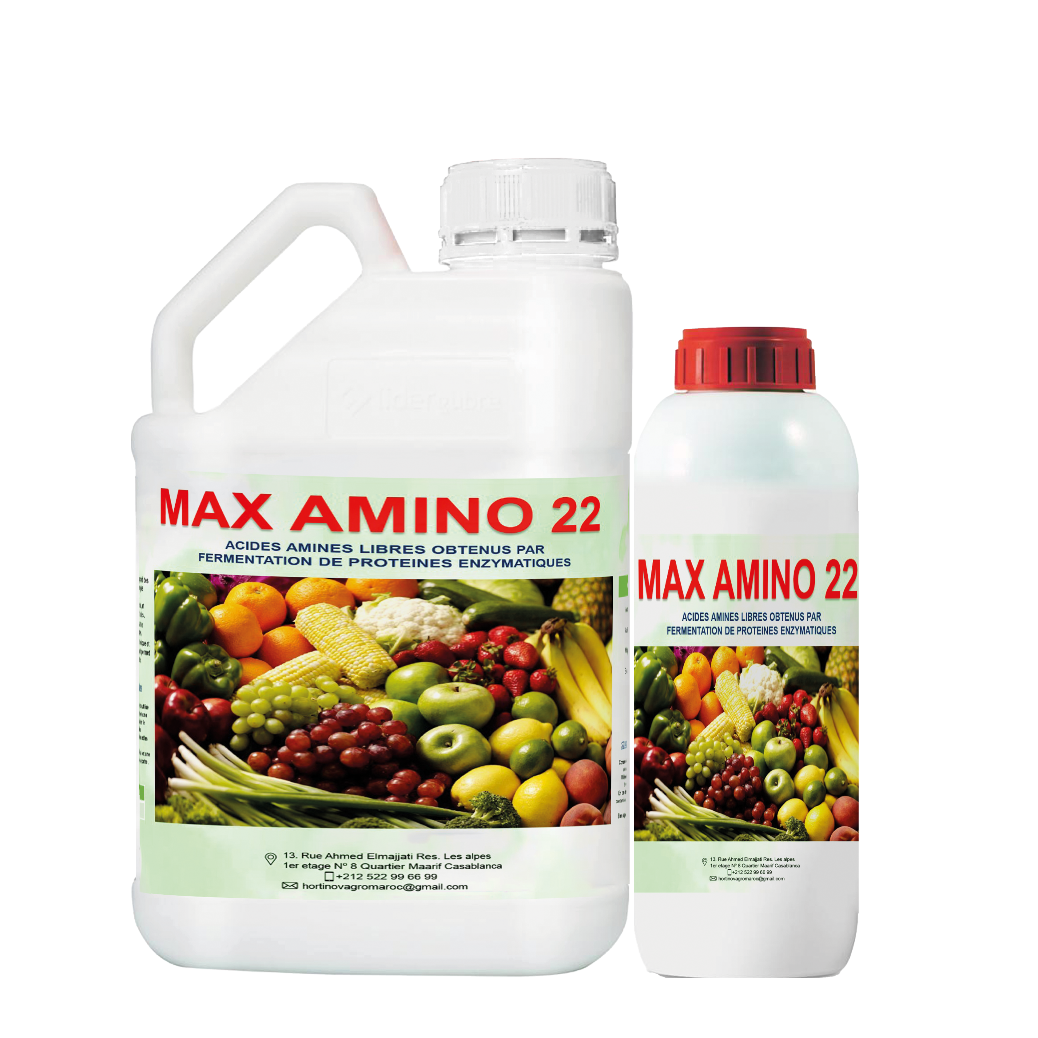 MAX AMINO 22 Est un engrais avec 22% des acides aminés de synthèse pour application dans les cultures maraichères et arbres fruitières, il indiqué comme bio stimulant de la végétation racine, feuilles, fleurs, et fruits, son absorption par la plante elle est complète et immédiate.